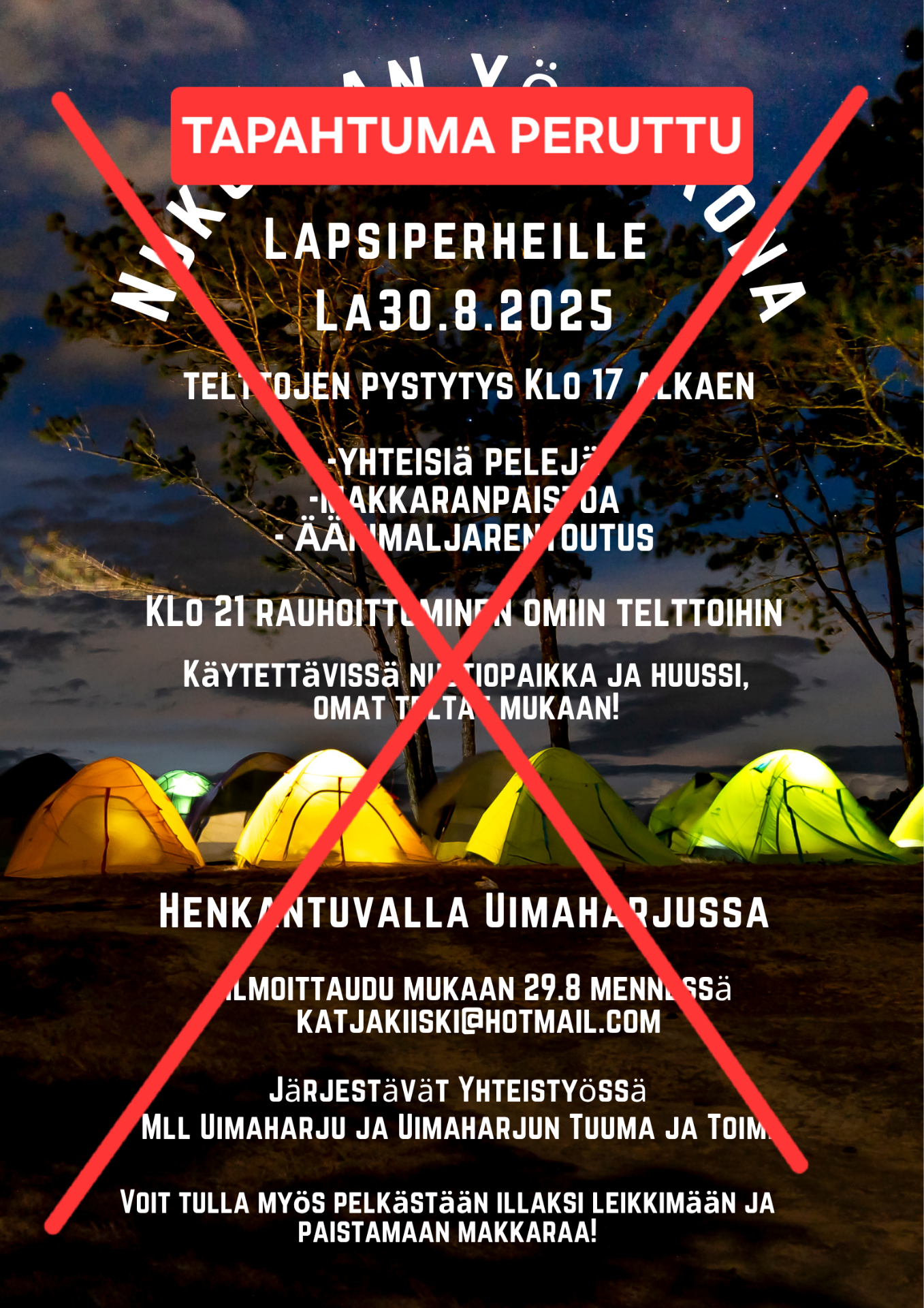 Uimaharjun MLL ja Uimaharjun Tuuma ja Toimi ry järjestävät Suomen Ladun lanseeraaman "Nukutaan yö ulkona" -tapahtuman lapsiperheille la 30.8.2025 klo 17 alkaen Henkantuvalla Uimaharjussa. Yhteisiä leikkejä, makkaranpaistoa (MLL tarjoaa makkarat ja mehut), äänimaljarentoutus. Käytössä nuotiopaikka ja huussi. Tapahtuma on maksuton. Mukaan mahtuu 15 telttakuntaa, joten ilmoittaudu viimeistään 29.8. mennessä sähköpostilla katjakiiski(at)hotmail.com. PS. Voit tulla myös pelkästään illaksi leikkimään ja paistamaan makkaraa.